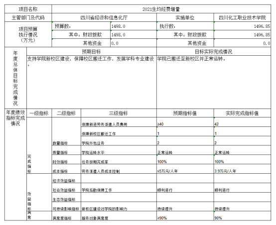 (7)2021生均经费增量项目绩效目标完成情况综述。项目全年预算数1498万元,执行数为1496.85万元,完成预算的99.92%。通过项目实施,完成保障校区搬迁工作,发展专业建设。