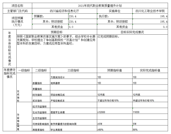(4)2021年现代职业教育质量提升计划项目绩效目标完成情况综述。项目全年预算数230.4万元,执行数为195.4万元,完成预算的84.81%。通过项目实施,按照《国家职业教育改革实施方案》的要求,结合学校中长期发展规划,学校提出了争创高职院校“双高计划”和创建应用型本科的发展目标,力建成应用型本科高校。