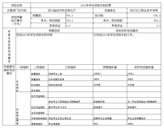 (6)2021年学生资助补助经费项目绩效目标完成情况综述。项目全年预算数976万元,执行数为976万元,完成预算的100%。通过项目实施,完成2021年学生资助补助工作。发现的主要问题:发放过程中对学生卡号的确定程序复杂,容易出错,下一步改进措施:向同类型高校学习先进的处理方法。